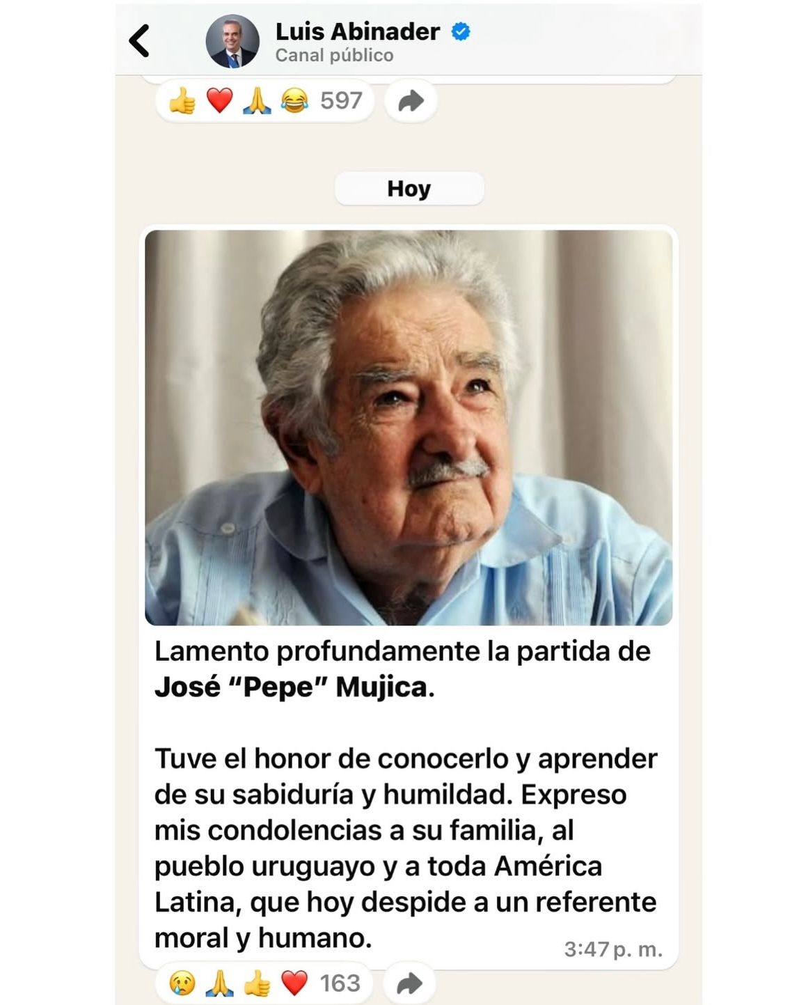 RZ NOTICIAS, SANTO DOMINGO.- El presidente de República Dominicana, Luis Abinader, lamentó el fallecimiento este martes del expresidente de Uruguay José “Pepe” Mujica.