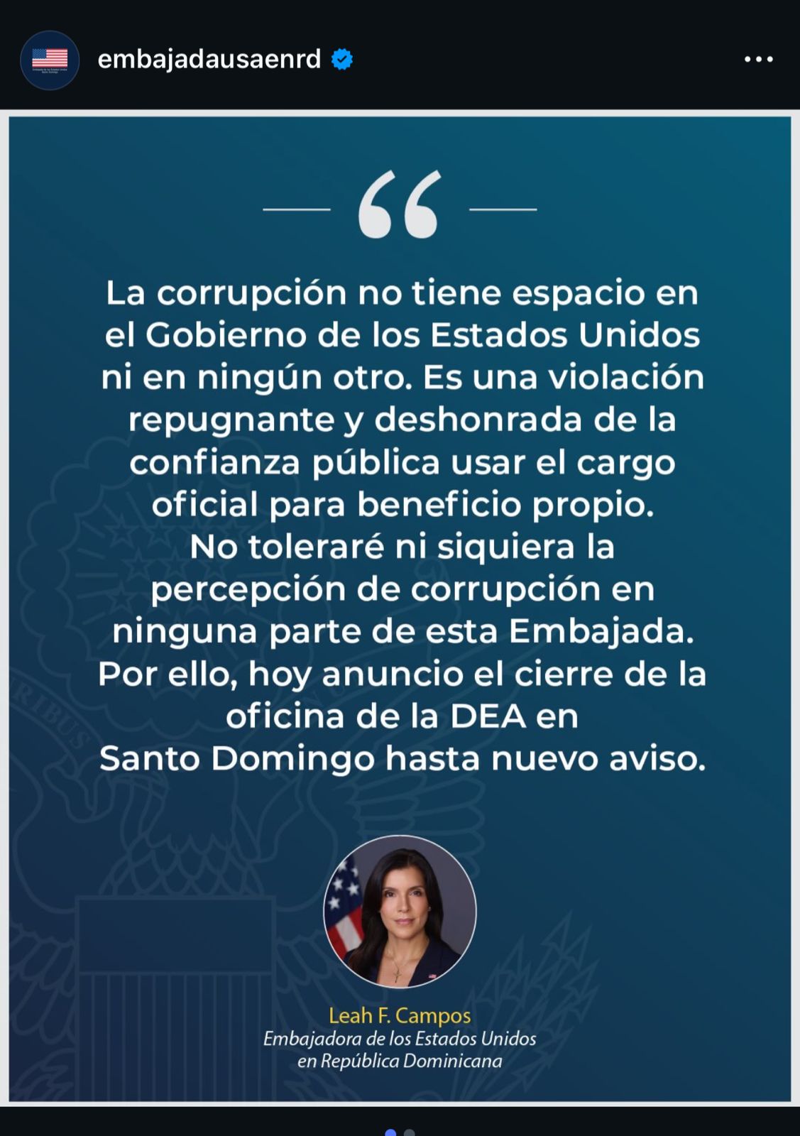 “No toleraré ni siquiera la percepción de corrupción en ningún lugar de la Embajada que dirijo. Por ello, hoy anunció el cierre de la oficina de la DEA en Santo Domingo hasta nuevo aviso”, escribió la embajadora.