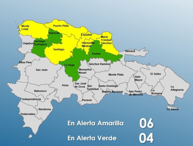 RZ NOTICIAS, SANTO DOMINGO.- El Centro de Operaciones de Emergencia (COE) colocó este martes seis provincias en alerta amarilla y mantiene cuatro en verde, por posibles crecidas de ríos, arroyos y cañadas, así como inundaciones repentinas o urbanas.