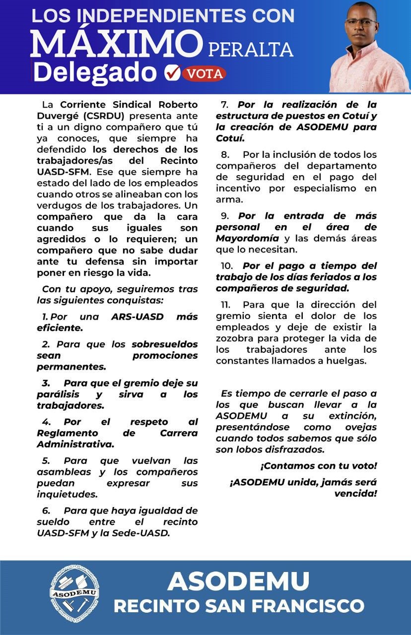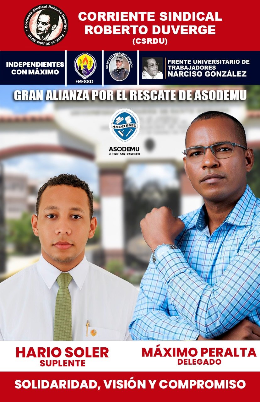 RZ NOTICIAS, SAN FRANCISCO DE MACORÍS.- Máximo Peralta, candidato a la dirección de la Asociación de Empleados Universitarios del Recinto de la Universidad Autónoma de Santo Domingo (UASD) San Francisco de Macorís (ASODEMU), fortaleció su candidatura este jueves al recibir el respaldo de cinco importantes corrientes laborales y presentar a Hairo Soler como su compañero de boleta, como suplente.